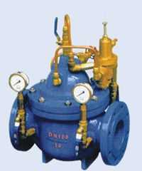 水力控制閥的介紹:水力控制閥就是用水壓控制的閥門,一般分為隔膜型和活塞型兩大類,兩者工作原理相同,它由一個主閥(如圖所示)及其附設(shè)的導(dǎo)管、導(dǎo)閥、針閥、球閥和壓力表等組成。根據(jù)使用目的、功能及場所的不同可演變成遙控浮球閥、減壓閥、緩閉止回閥、流量控制閥、泄壓閥、水力電動控制閥等。水力控制閥都是以上下游壓力差△P為動力,由導(dǎo)閥控制,使隔膜(活塞)液壓式差動操作、完全由水力自動調(diào)節(jié),從而使主閥閥盤完全開啟,或完全關(guān)閉及處于調(diào)節(jié)狀態(tài),當(dāng)進(jìn)入隔膜(活塞)上方控制室內(nèi)的壓力水被排到大氣或下游低壓區(qū)時,作用在閥盤底部和隔膜下方的壓力值就大于上方的壓力值,所以將主閥閥盤推到完全開啟的位置:當(dāng)進(jìn)入隔膜(活塞)上方控制室的壓力水不能排到大氣或下游低壓區(qū)時,作用在隔膜(活塞)上方的壓力值就大于下方的壓力值,所以就會把主閥閥盤壓到完全關(guān)閉的位置:當(dāng)隔膜(活塞)上方控制室內(nèi)的壓力值處于入口壓力與出口壓力中間時,主閥閥盤就處于調(diào)節(jié)狀態(tài),其調(diào)節(jié)位置取決于導(dǎo)管系統(tǒng)中的針閥和可調(diào)導(dǎo)閥的聯(lián)合控制作用,可調(diào)導(dǎo)閥可以通過下游的出口壓力并隨它的變化而開大或關(guān)小其自身的小閥口,從而改變隔膜(活塞)上方控制室的壓力值,控制主閥閥盤的調(diào)節(jié)位置